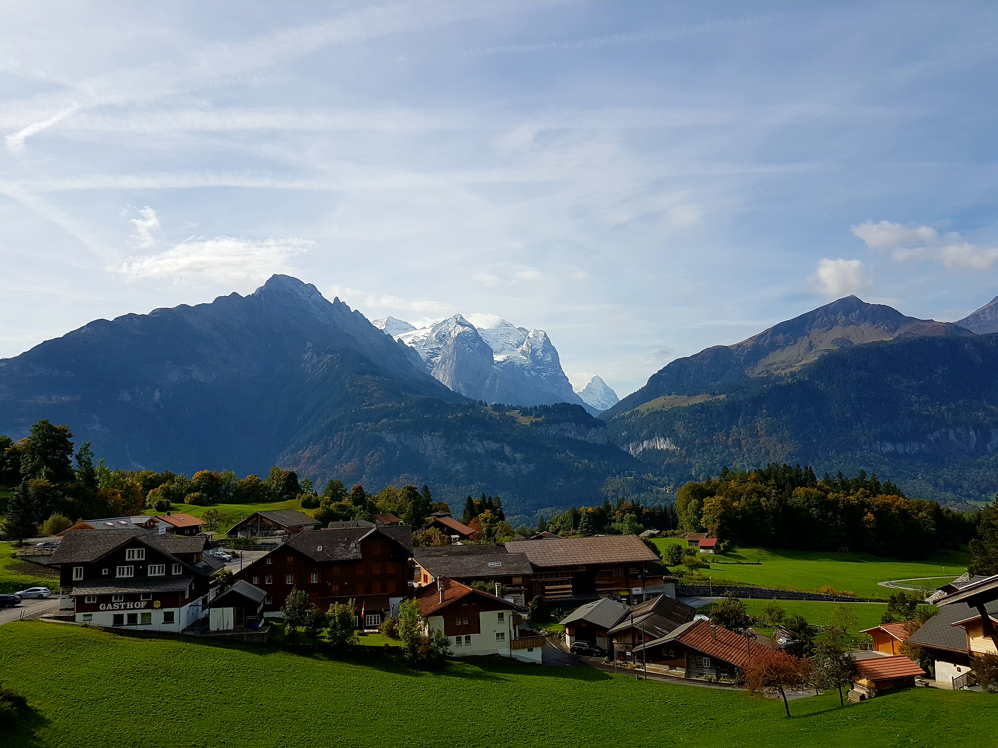 Meiringen ligger inn i en dal omgitt av majestetiske fjell med snø på toppen. Et virkelig syn, og en flott liten by. En by hvor by og land er om hverandre. Kuene beitet omtrent i sentrum, og geitene lekte i veikanten. Høner i hagene både på eneboliger og til leiligheter i blokker. Et landskap med gjøkur oppe i fjellsidene. Kan det være mer romantisk?