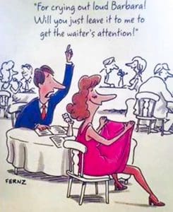 Egentlig bryr jeg meg lite om det blir servert slik eller sånn, og de aller fleste kelnere er jo trivelige, hyggelige, arbeidsomme og flinke. Det viktigste er jo tross alt at maten og stemningen er god, og at vi får en hyggelig opplevelse. Noe den som regel er, men får du en ufordragelig kelner blir måltidet ødelagt.