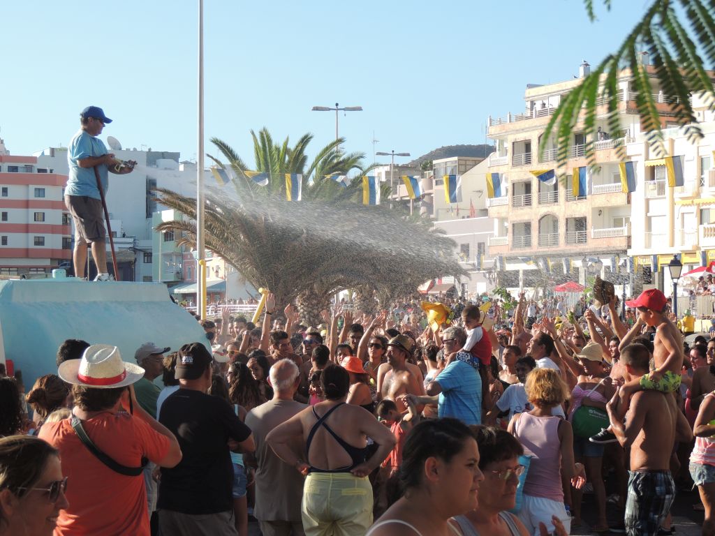 Bilder fra Vannfestivalen i Arguineguin. NB! Alle som deltar i toget blir gjennomvåte, så mange stiller like godt i badetøy.