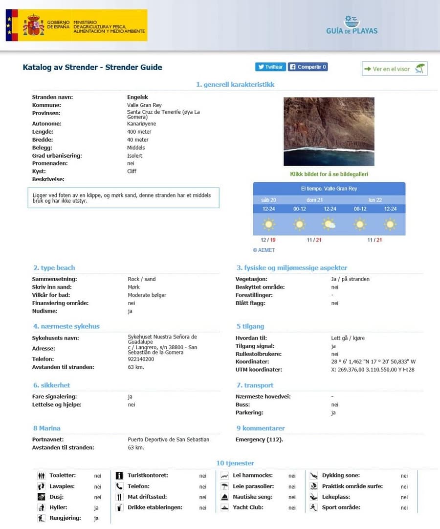 NB! La Caleta de Hermigua (300 meter lang) var ikke oppført på Miljøverndepartementets oversikt som naturiststrand, og heller ikke i appen.