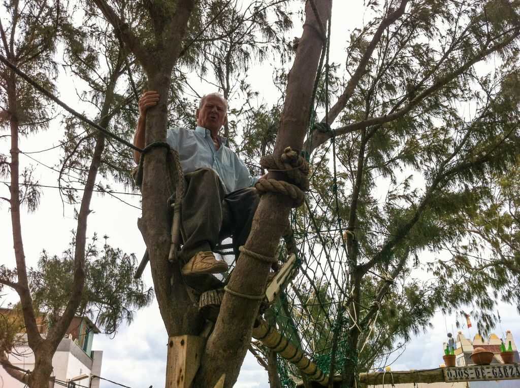 Han viste oss hvor praktisk det var å sitte oppe i trærne sine, hvordan han kunne komme seg fra tre til tre på tauverket uten å være Tarzan (det vokser ikke lianer her på øya), viste oss det han hadde laget av gammelt skrot, og kjørte oss i en vogn som bare gikk i sirkel. Det ble virkelig en uforglemmelig omvisning.