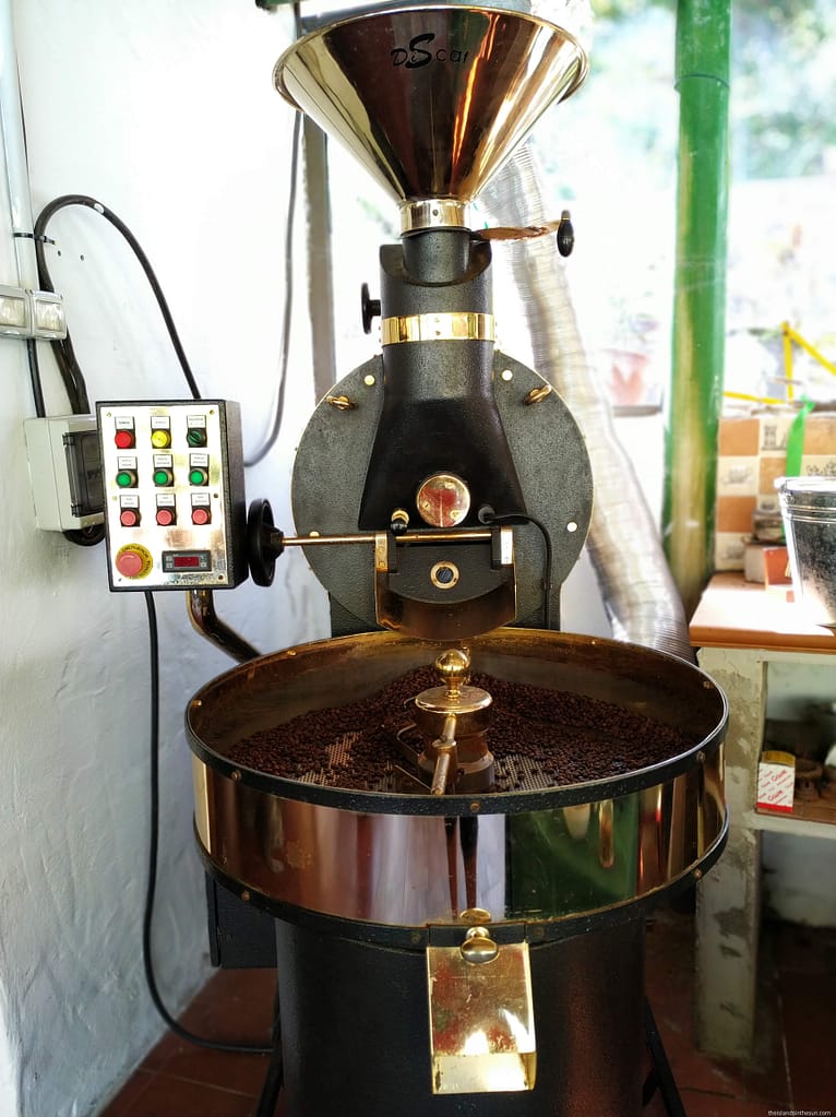 Nå er det ikke bare på fincaen med kaffeskolen de produserer kaffe. Det er flere plantasjer i området. På noen av dem kan du få en omvisning samt prøvesmaking på deres kaffe, vin og appelsiner, samt litt kake og ost. (Det var ihvertfall det vi fikk på Bodega Los Berrazales.)